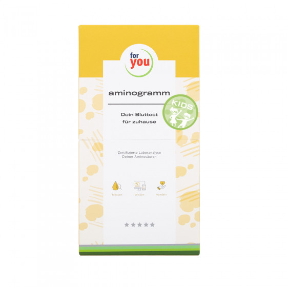 Das beliebte for you aminogramm als Bluttest für zuhause gibt es ab sofort auch für Kinder im Alter von 3 bis 17 Jahren. Nutzen Sie das kinderfreundliche Test-Kit zur Bestimmung von 25 relevanten Aminosäuren.