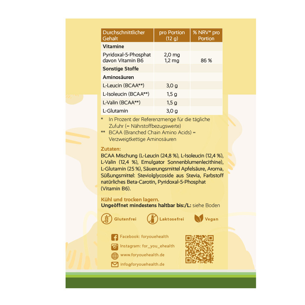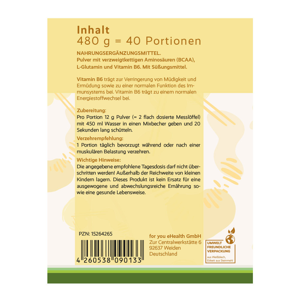Getränkepulver mit verzweigtkettigen Aminosäuren (BCAAs = Branch-Chain Amino Acids), L-Glutamin und aktiviertem Vitamin B6.