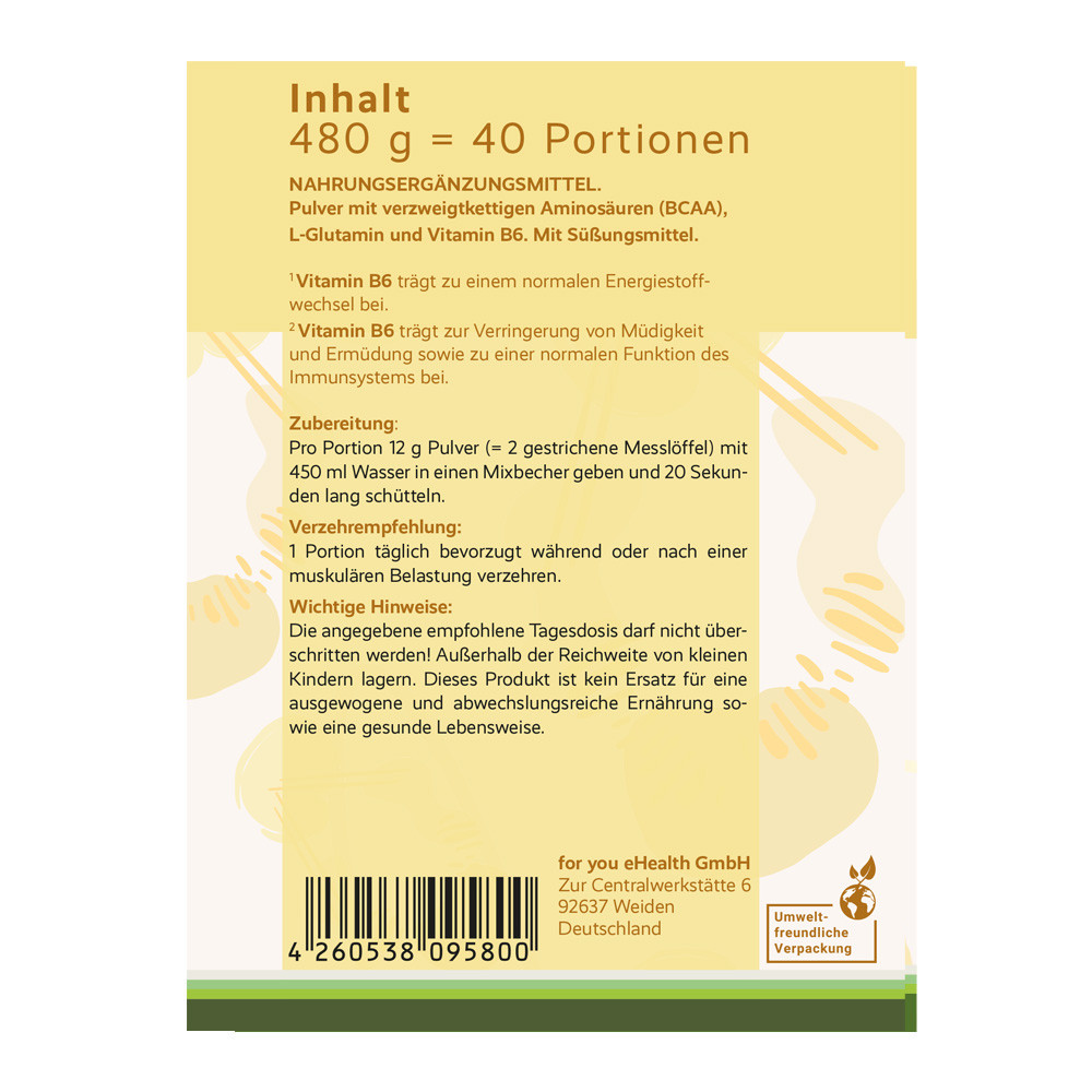 BCAA + Glutamin ist ein Getränkepulver mit verzweigtkettigen Aminosäuren (BCAAs), L-Glutamin und aktivem Vitamin B6.