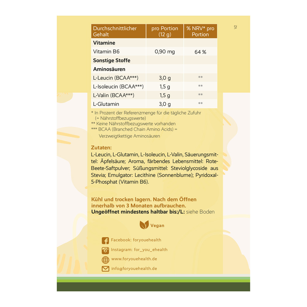 L-Leucin, L-Glutamin, L-Isoleucin, L-Valin, Säuerungsmittel: Äpfelsäure; Aroma, färbendes Lebensmittel: Rote-Beete-Saftpulver; Süßungsmittel: Steviolglycoside aus Stevia; Emulgator: Lecithine (Sonnenblume); Pyridoxal-5-Phosphat (Vitamin B6).