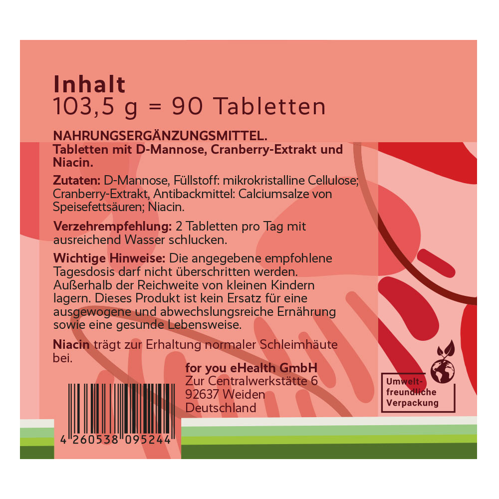 D-mannose + cranberry ist ein Nahrungsergänzungsmittel in Tablettenform mit D-Mannose, Cranberry-Extrakt und Niacin.