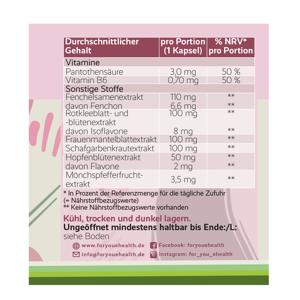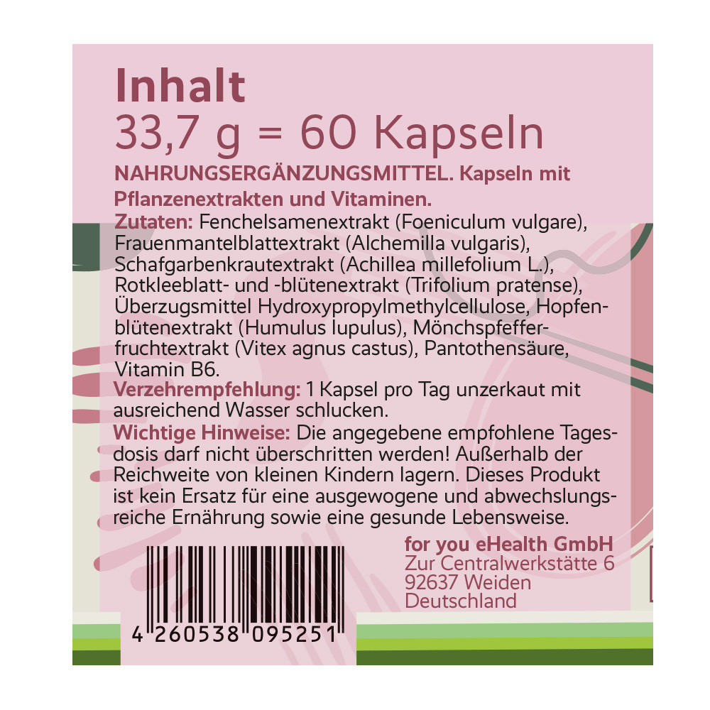 - enthält wertvolle Pflanzenextrakte aus Fenchel, Frauenmantel, Schafgarbe, Rotklee, Hopfen und Mönchspfeffer, sowie den Vitaminen B5 & B6.