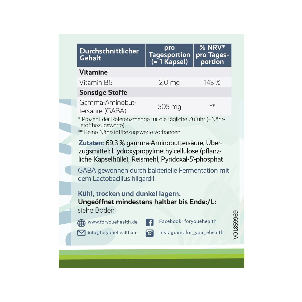 69,3 % gamma-Aminobuttersäure, Überzugsmittel: Hydroxypropylmethylcellulose (pflanzliche Kapselhülle); Reismehl, Pyridoxal-5-phosophat.