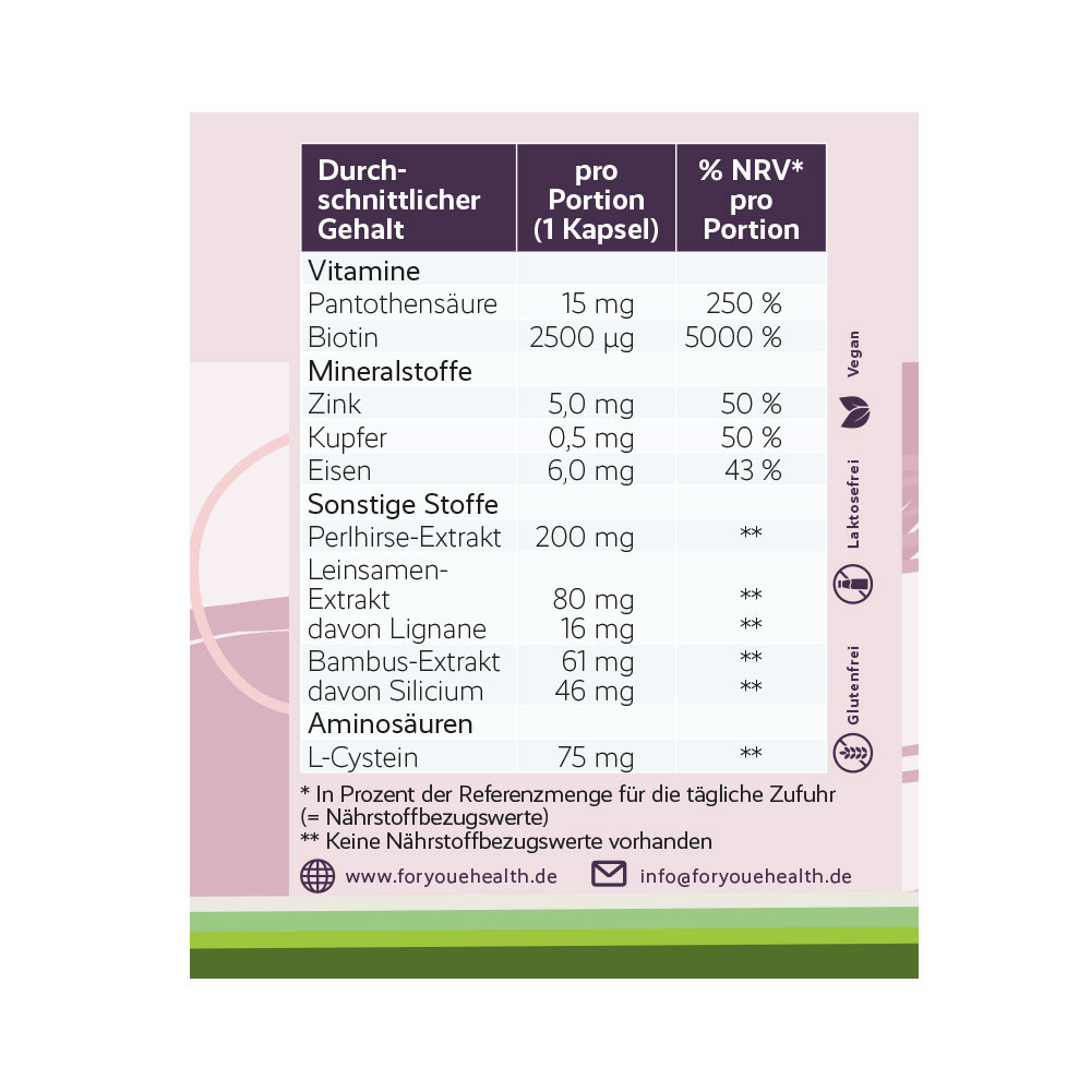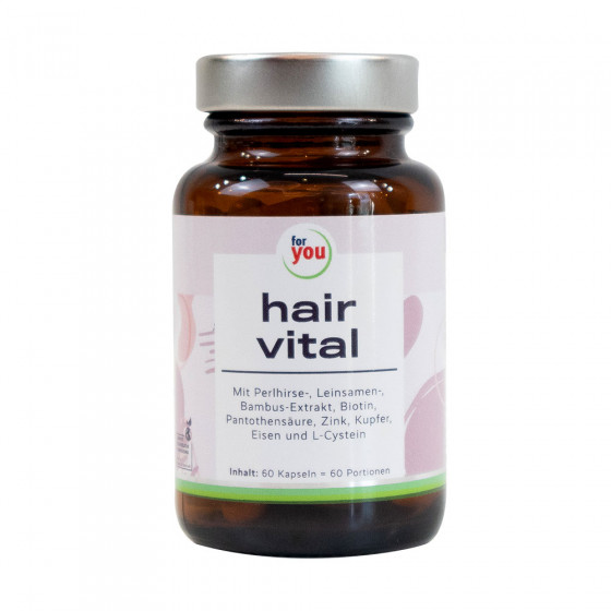 for you hair vital – ist Nahrungsergänzungsmittel für Haut, Haare und Nägel. Es besteht aus Extrakten der Perlhirse, Leinsamen und Bambus, Spurenelementen und Vitaminen, ergänzt mit L-Cystein.