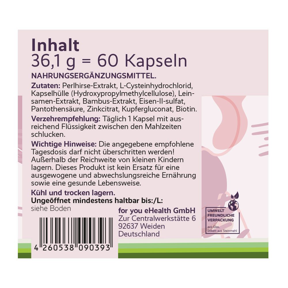 Perlhirse-Extrakt, L-Cysteinhydrochlorid, Kapselhülle (Hydroxypropylmethylcellulose), Leinsamen-Extrakt, Bambus-Extrakt, Eisen-II-sulfat, Pantothensäure, Zinkcitrat, Kupfergluconat, Biotin.