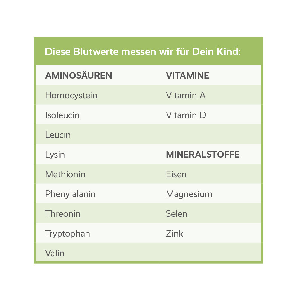 Kinder sind durch Kita, Schule und Spielplätze vielen Bakterien und Keimen ausgesetzt. Da braucht es ein starkes Immunsystem, um gut geschützt durch den Alltag zu kommen. Nährstoffmängel fördern Infektanfälligkeit und eine geschwächte Immunabwehr. Stärken Sie das Immunsystem Ihres Kindes, indem Sie Aminosäuren, Vitamine und Mineralstoffe regelmäßig überprüfen.