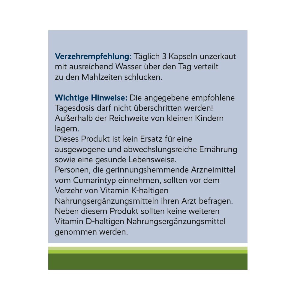 Personen, die gerinnungshemmende Arzneimittel vom Cumarintyp einnehmen, sollten vor dem Verzehr von Vitamin K-haltigen Nahrungsergänzungsmitteln ihren Arzt befragen.