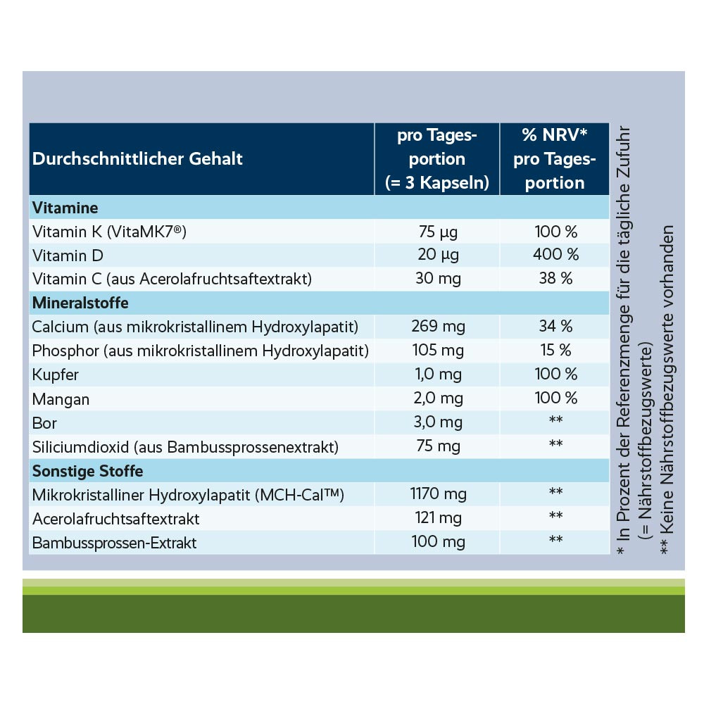Mikrokristalliner Hydroxylapatit, Gelatine (Kapselhülle), Acerolafruchtsaftextrakt, Bambussprossenextrakt, Menachinon-7 (Vitamin K2), Borsäure, Cholecalciferol (Vitamin D3), Kupfergluconat, Mangansulfat.