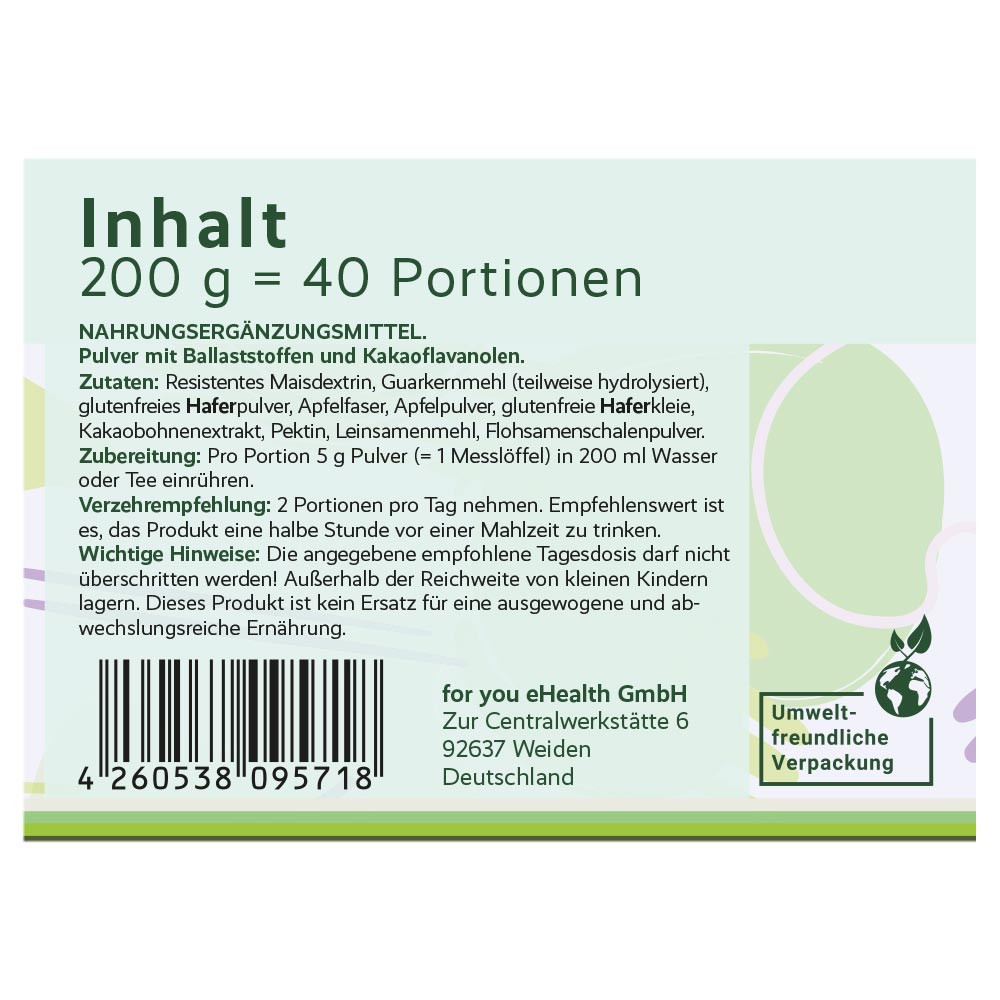 - Kakaobohnenextrakt: Ergänzt den Faserkomplex mit wertvollen Polyphenolen, die antioxidativ und präbiotisch wirken.
