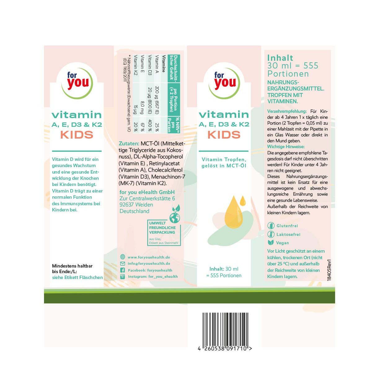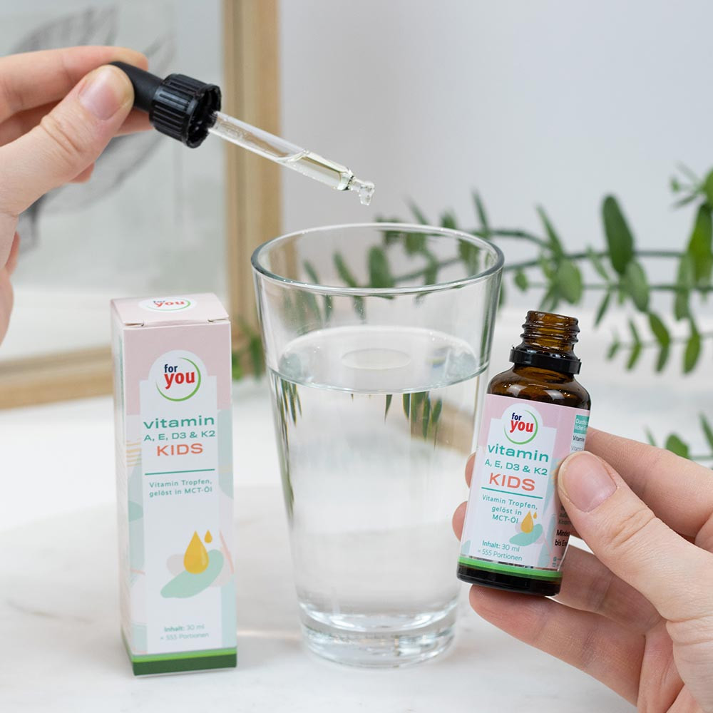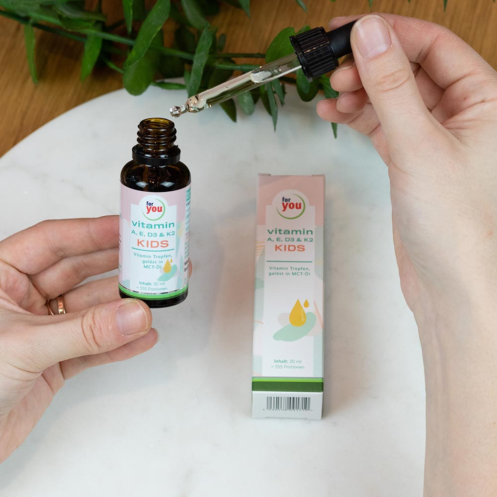 vitamin A, E, D3 & K2 KIDS enthalten alle fettlöslichen Vitamine und sind auf den Bedarf von Kindern abgestimmt.
