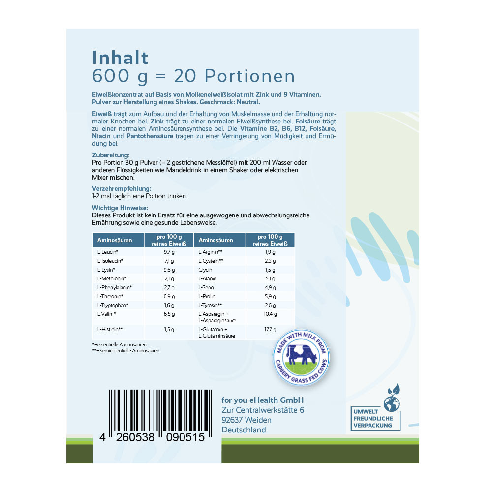 99,7 % Molkeneiweißisolat (aus Weidemilch von grasgefütterten irischen Kühen, mit Emulgator: Lecithine (Sonnenblume)), Vitamin E, Niacin, Pantothensäure, Vitamin B6, Vitamin B2, Vitamin B1, Folsäure, Biotin, Vitamin B12, Zinkcitrat.