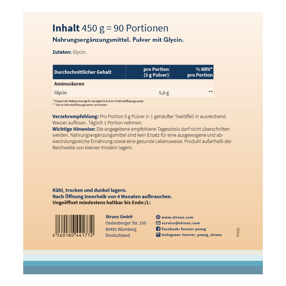 Das forever young Glycin ist vegan, gluten- und laktosefrei, sowie frei von Zusatzstoffen.