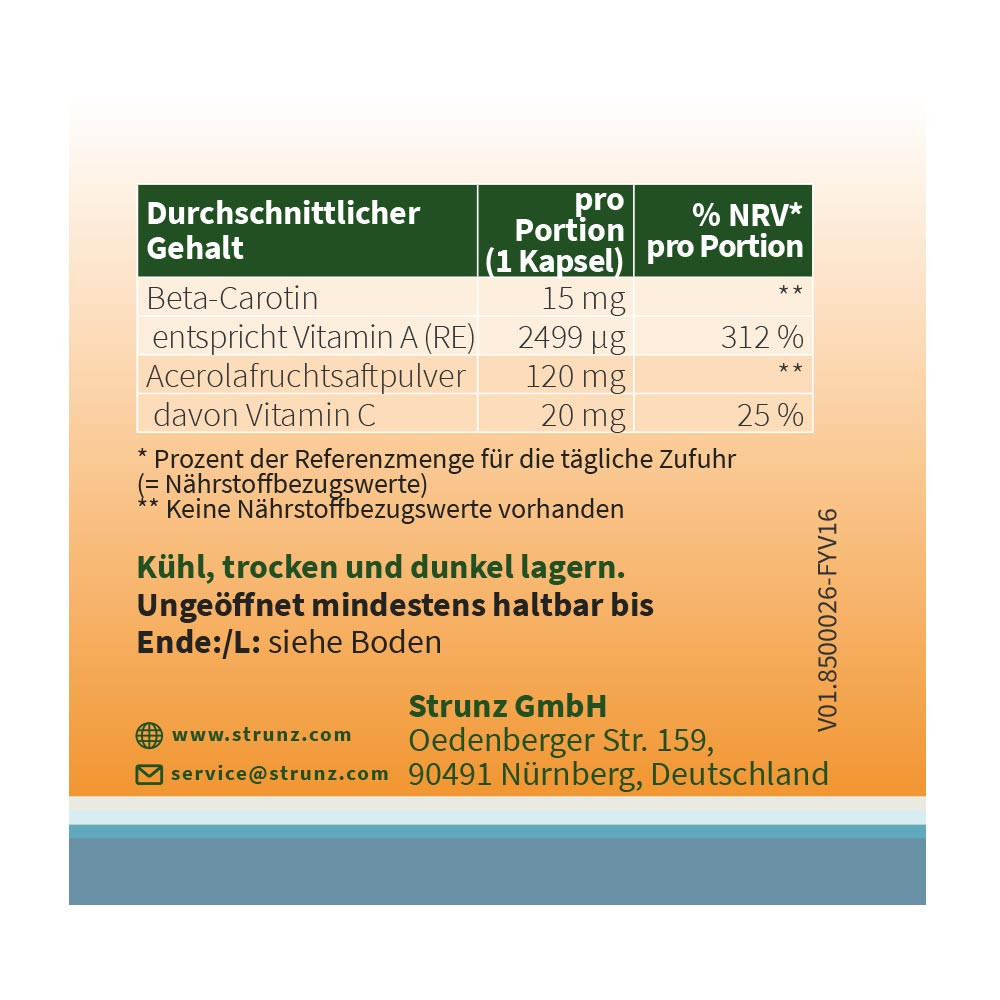 Unser natürliches Beta-Carotin wird aus der Fermentation von Blakeslea trispora, einem Pilz gewonnen. Das Beta-Carotin wird ergänzt mit natürlichem Vitamin C aus der Acerolafrucht.