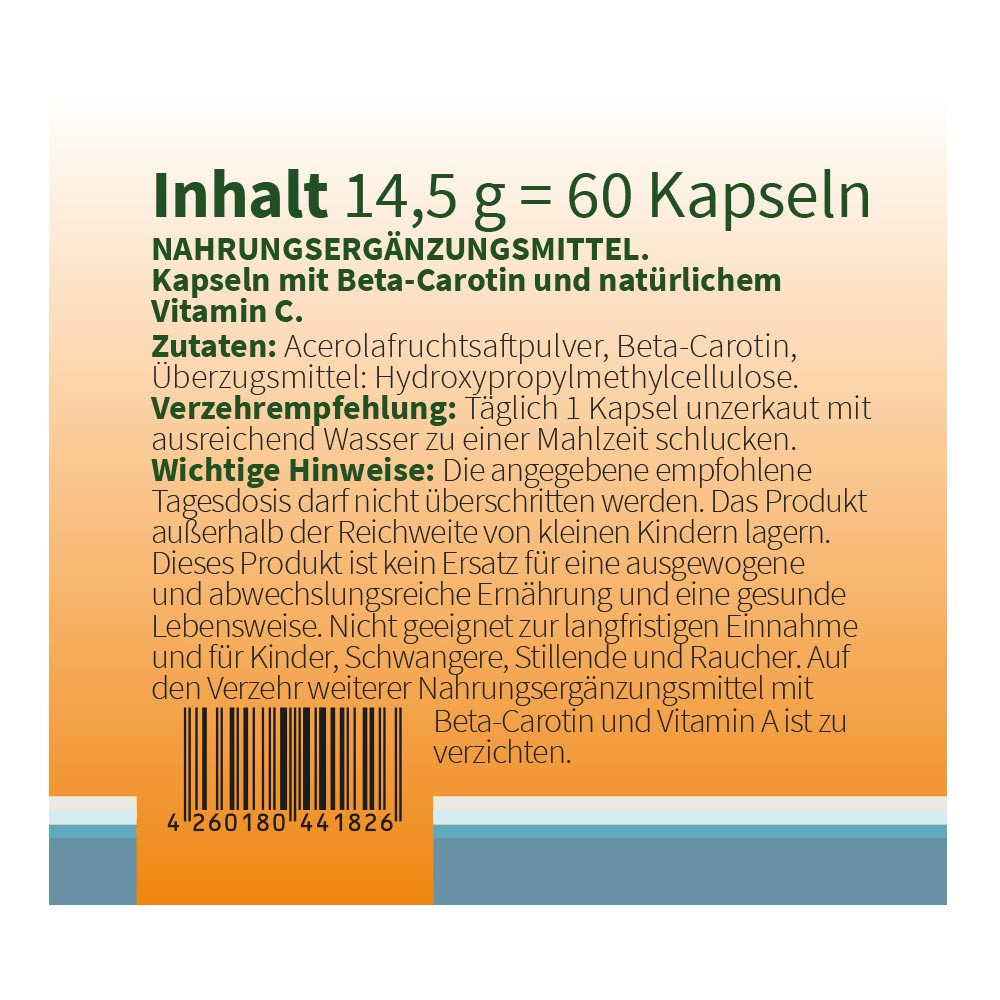 Beta-Carotin ist ein Nahrungsergänzungsmittel in Kapselform und enthält Beta-Carotin aus der Fermentation von Blakeslea trispora, einem Pilz. Zusätzliches natürliches Vitamin C aus der Acerola Frucht ergänzt das Beta-Carotin.