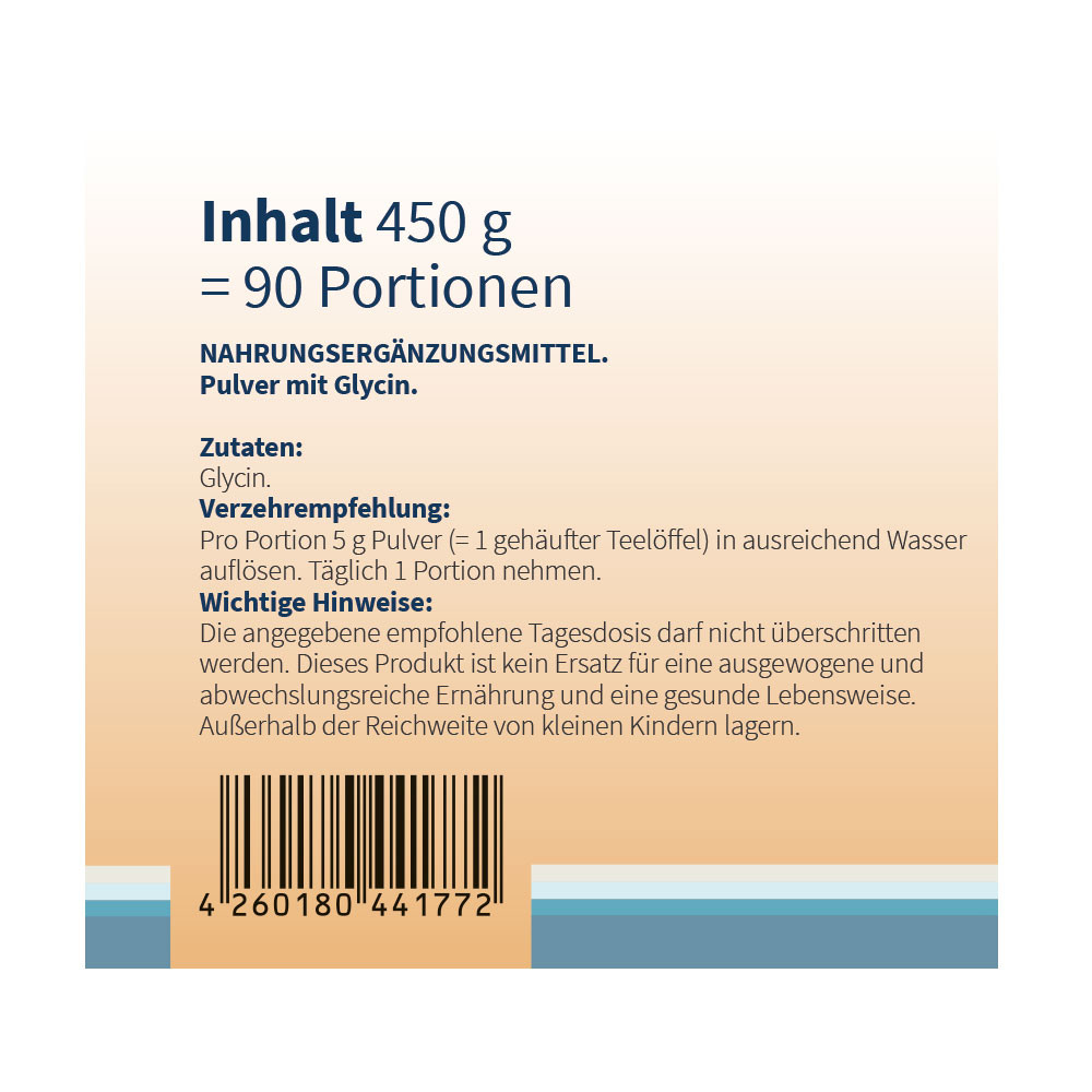 Glycin ist ein Nahrungsergänzungsmittel in Pulverform zum Auflösen und besteht zu 100% aus der reinen Aminosäure Glycin.