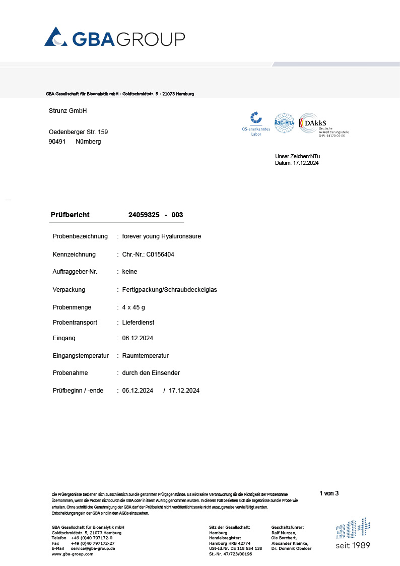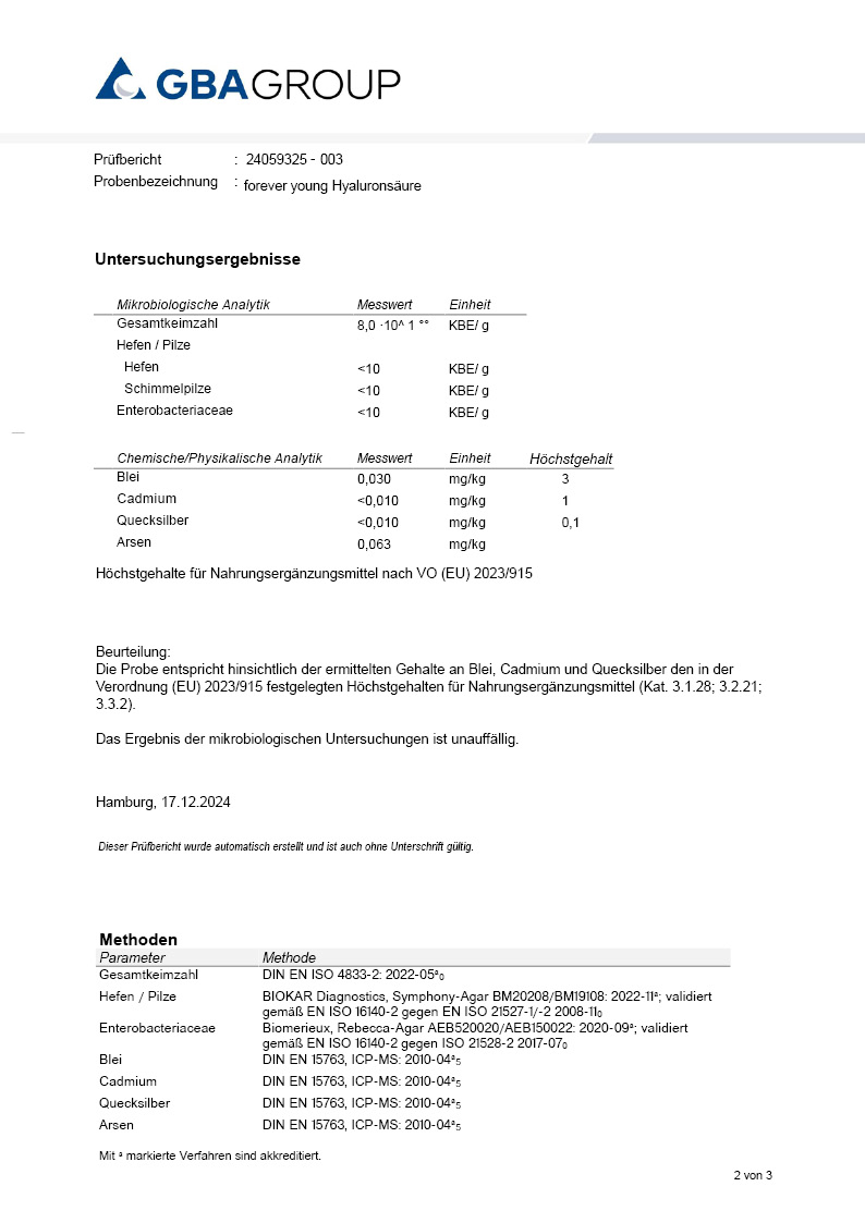 Unsere Produkte werden durch ein unabhängiges externes Labor geprüft, um höchste Qualität und Sicherheit zu gewährleisten. Durch diese Laboranalysen stellen wir sicher, dass unsere Produkte den strengsten Qualitätsstandards entsprechen. Wir möchten unseren Kunden damit Transparenz, Sicherheit und Zuverlässigkeit entgegenbringen.
