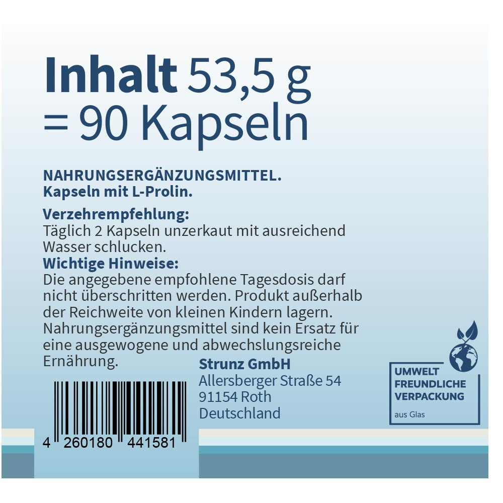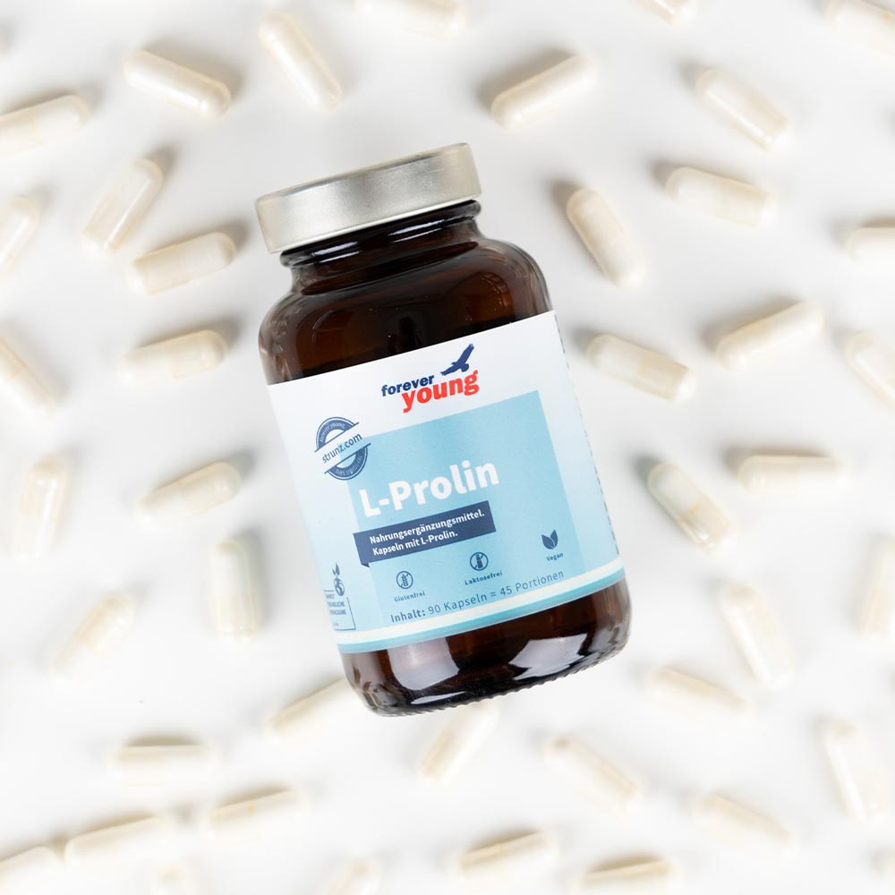 L-Prolin ist ein Nahrungsergänzungsmittel in Kapselform bestehend aus der Aminosäure L-Prolin.