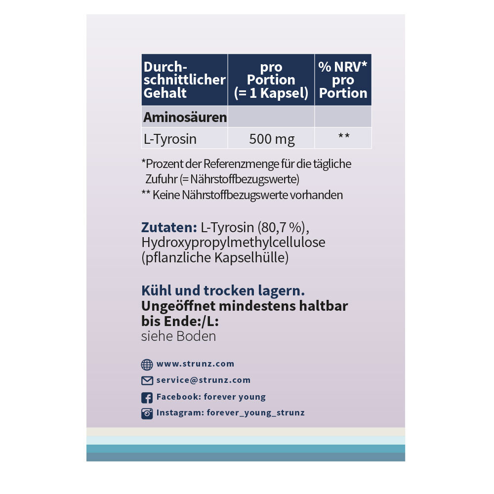 L-Tyrosin ist ein Nahrungsergänzungsmittel in Kapselform bestehend aus der Aminosäure L-Tyrosin auf pflanzlicher Basis.