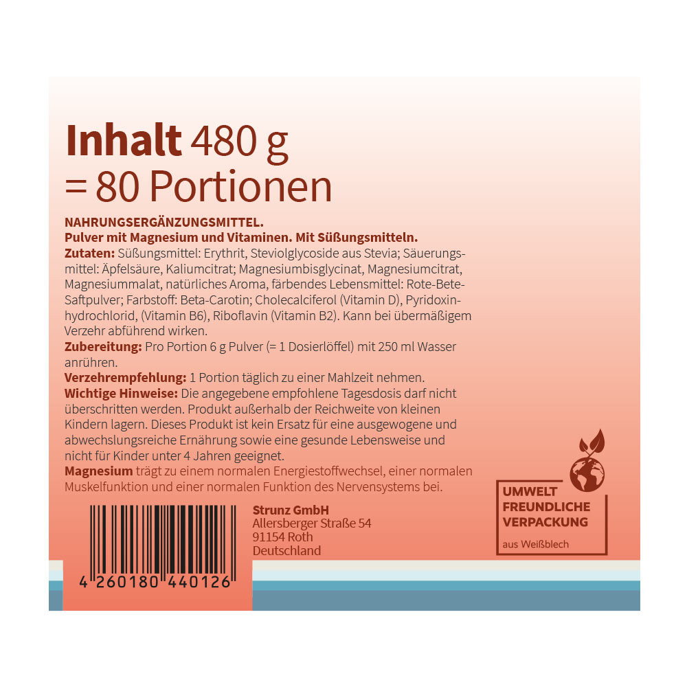 Süßungsmittel: Erythrit; Säuerungsmittel: Citronensäure; Magnesiumbisglycinat, Magnesiumcitrat, Magnesiummalat, Kaliumcitrat, natürliches Aroma, färbendes Lebensmittel: Rote-Bete-Saftpulver; Süßungsmittel: Steviolglycoside aus Stevia; Cholecalciferol (Vitamin D3), Pyridoxinhydrochlorid (Vitamin B6), Riboflavin (Vitamin B2), Farbstoff: Beta-Carotin.