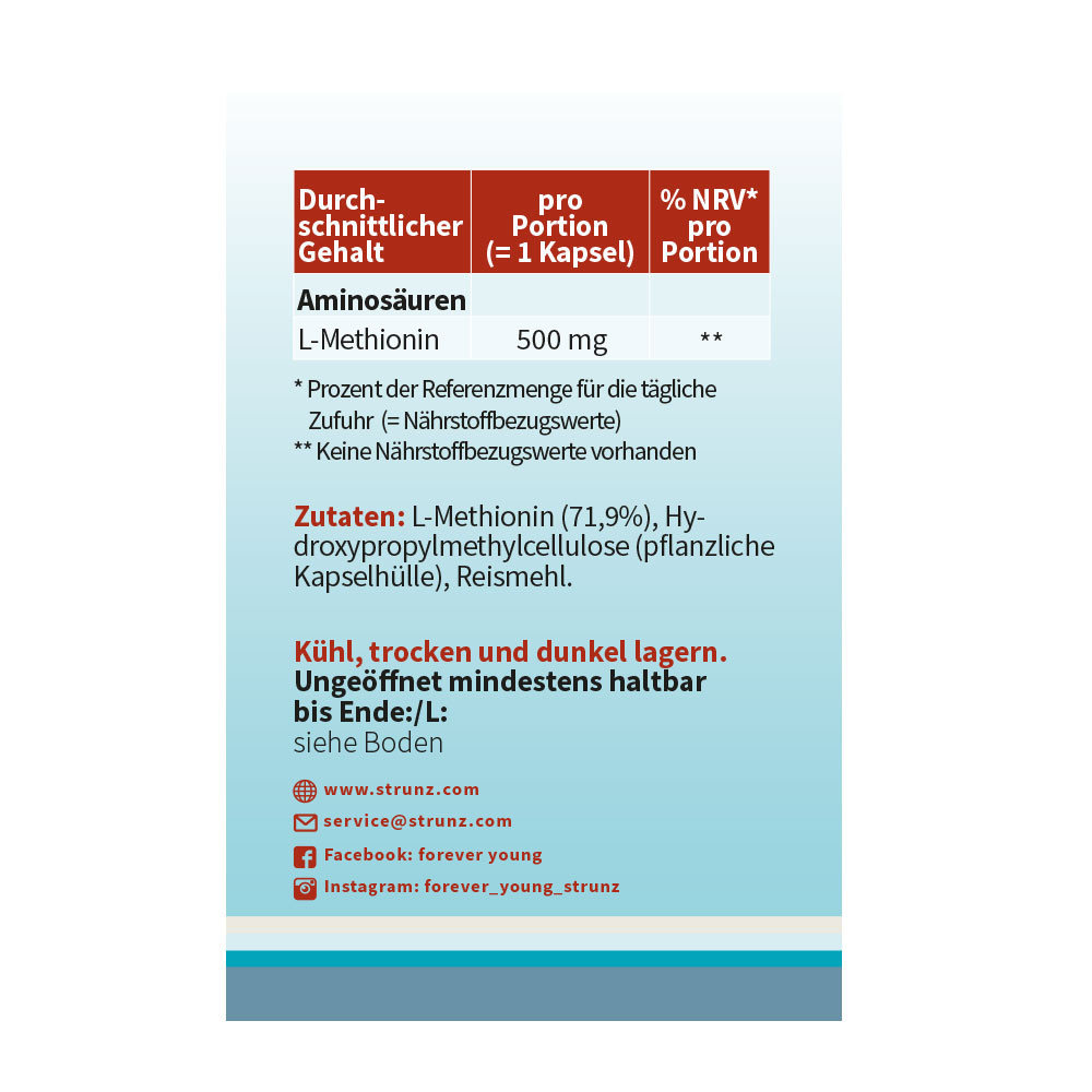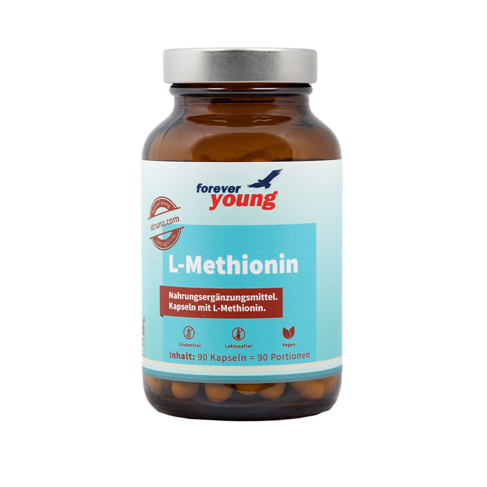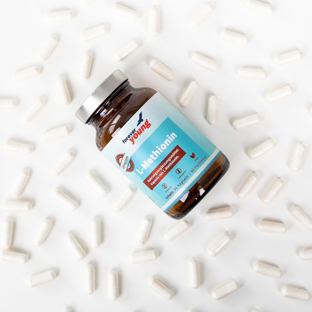 L-Methionin ist ein Nahrungsergänzungsmittel in Kapselform auf natürlicher, pflanzlicher Basis und enthält die essentielle, proteinogene (eiweißbildende) Aminosäure L-Methionin.