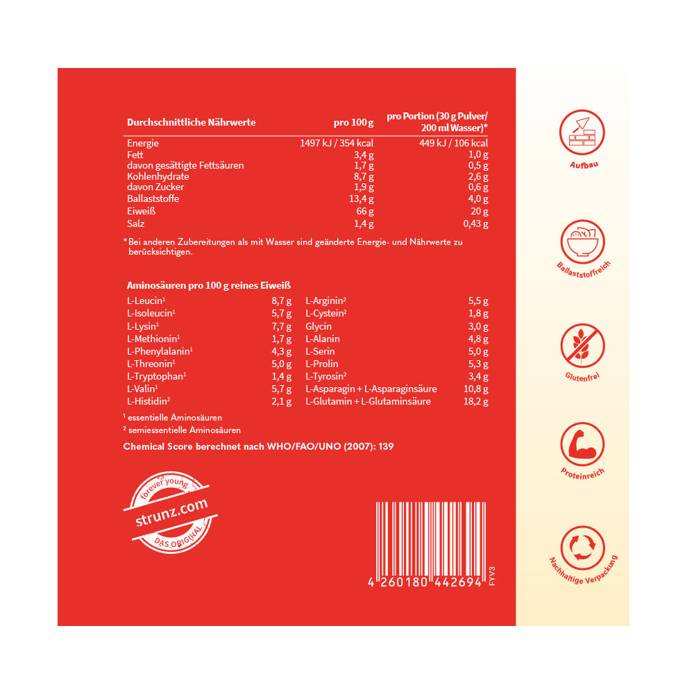 - 3 pflanzliche Eiweißquellen (Sojaproteinisolat, Erbsenprotein und Reisprotein)