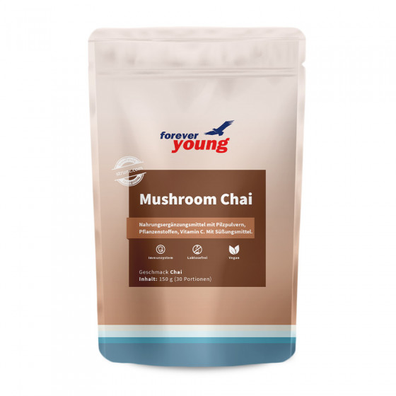 Mushroom Chai ist Seelenschmeichler und Frühstücksgetränk in einem. Die Geschmackskombination aus exotischen Gewürzen und Kakao zaubert Ihnen schon mit dem ersten Schluck ein Lächeln aufs Gesicht. Als leckere Alternative zu Kaffee kann er in Ihrer Morgenroutine Platz finden, aber eignet sich auch, um aus dem Mittagstief zu kommen oder um lange und intensive Konzentrations-Phasen zu meistern. Die enthaltenen Vitalpilze unterstützen Ihre Gesundheit in vielerlei Hinsicht und machen den Mushroom Chai zu einem echten Kraftpaket.