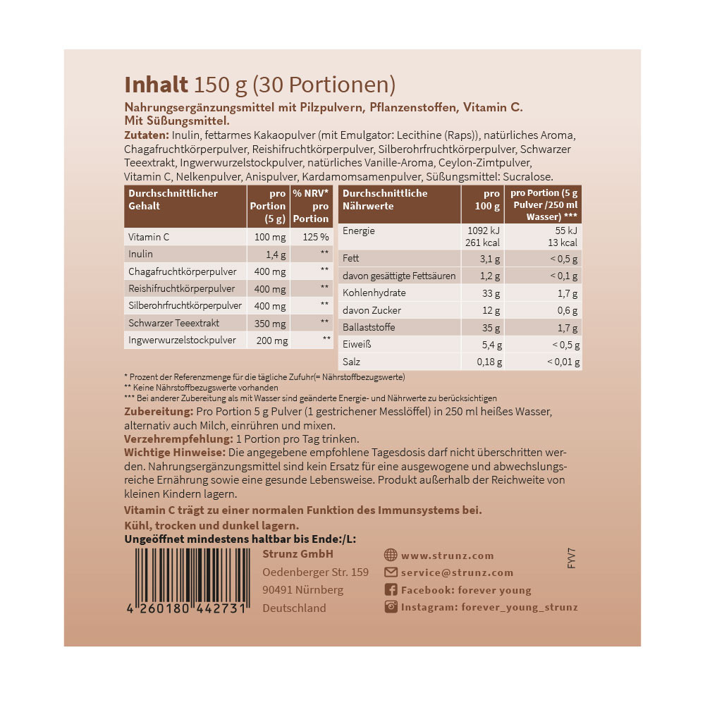 Inulin, fettarmes Kakaopulver (Emulgator: Lecithine (Raps)), natürliches Aroma, 8 % Chagafruchtkörperpulver, 8 % Reishifruchtkörperpulver, 8 % Silberohrfruchtkörperpulver, Schwarzer Teeextrakt, Ingwerwurzelstockpulver, natürliches Vanille-Aroma, Ceylon-Zimtpulver, L-Ascorbinsäure, Nelkenpulver, Anispulver, Kardamomsamenpulver, Süßungsmittel: Sucralose.