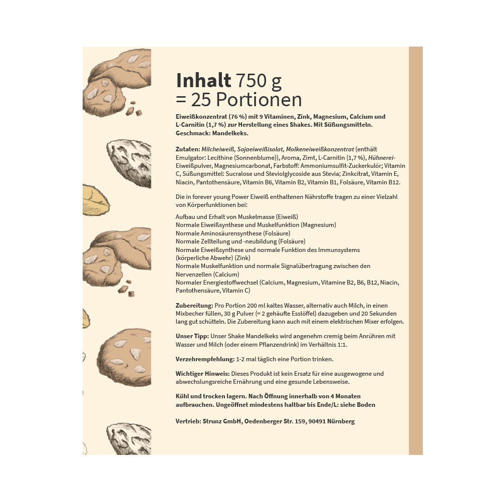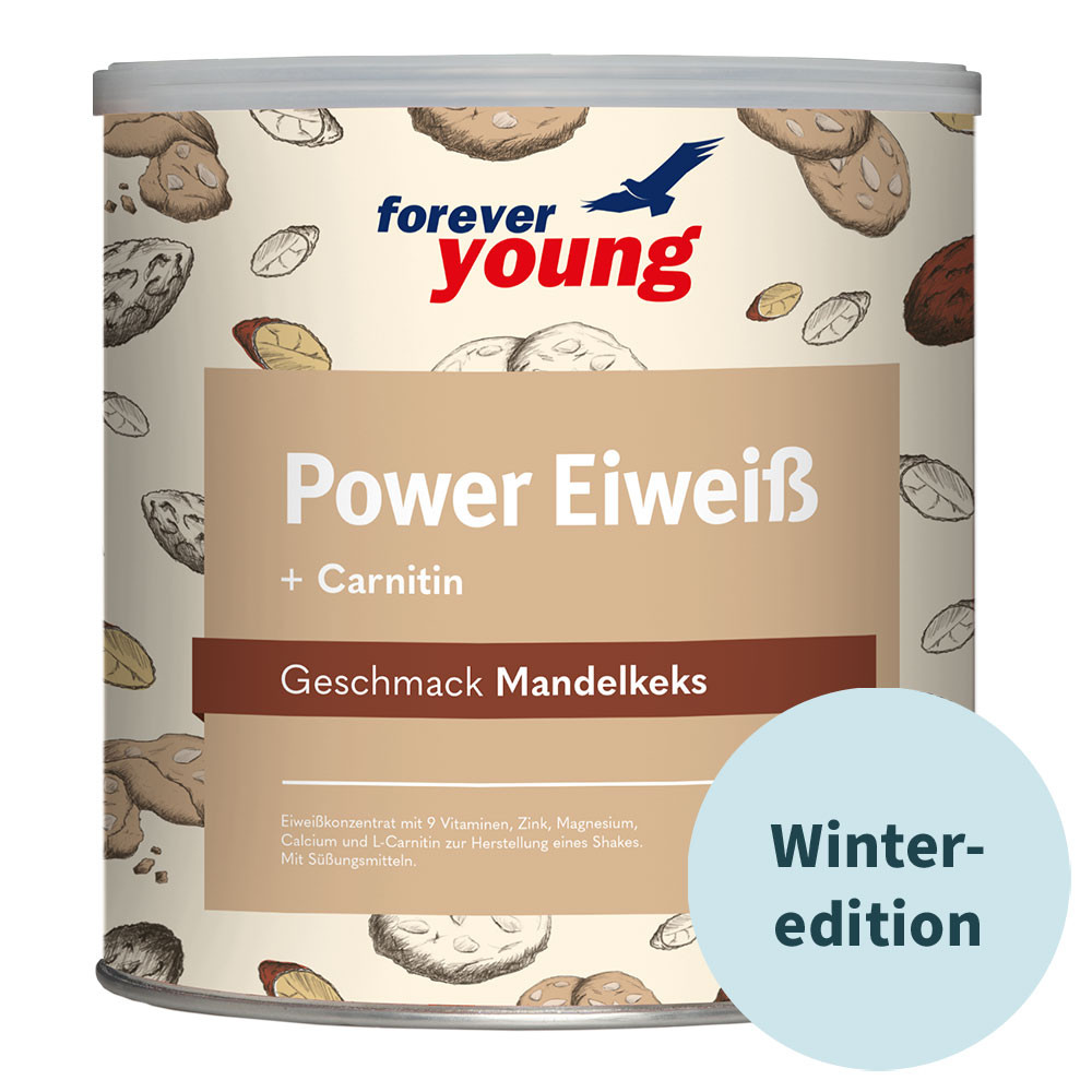 Das forever young Power Eiweiß ist ein hochwertiges Eiweißpulver mit L-Carnitin in der leckeren Geschmacksrichtung Mandelkeks.