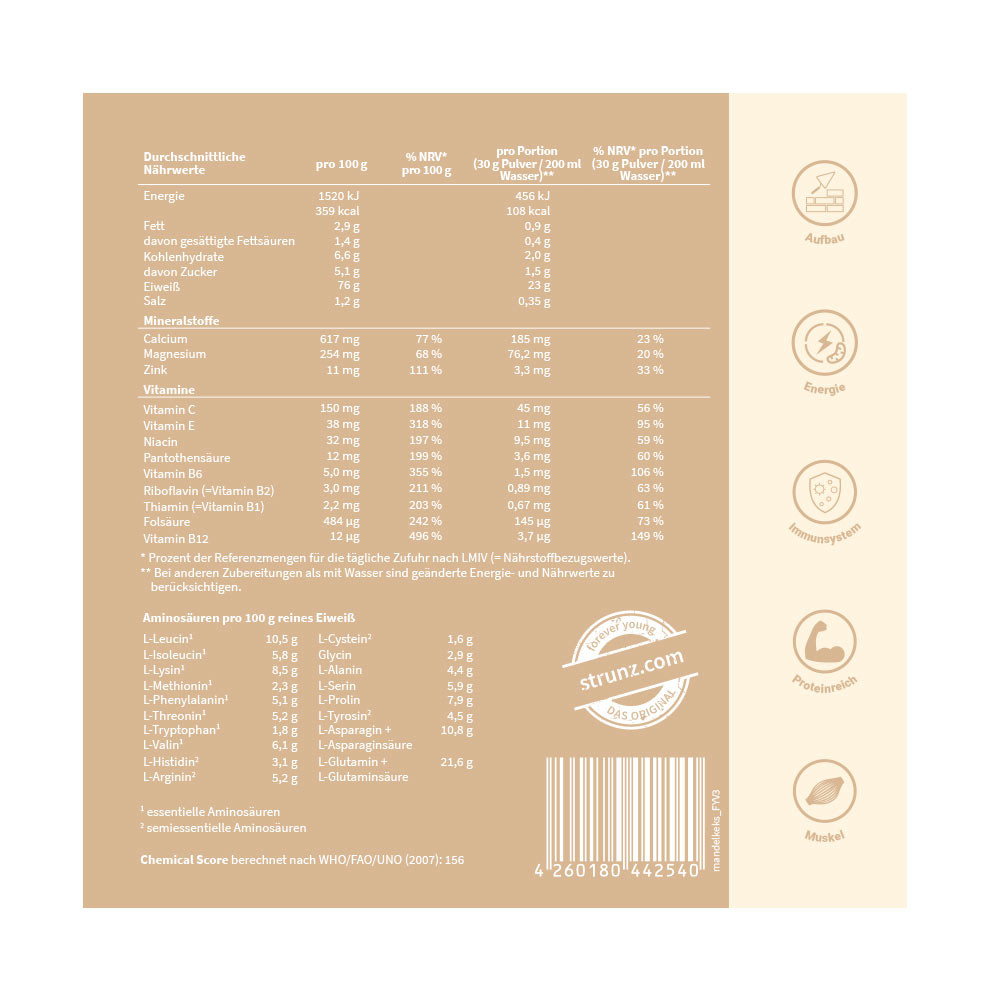 Das Power Eiweiß Mandelkeks ist ein Eiweiß-Konzentrat mit multifunktionellen Eigenschaften. Die Mischung aus biologisch hochwertigen verschiedenen Proteinquellen ist gut löslich, leicht verdaulich, fettarm und wohlschmeckend. Durch die Kombination verschiedener Eiweißquellen hat das forever young Power Eiweiß eine ausgewogene Bilanzierung aller Aminosäuren.