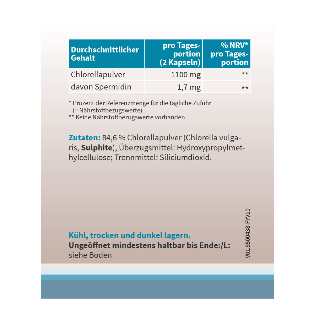 Unsere Spermidin Kapseln bestehen aus der spermidinhaltigen Alge Chlorella vulgaris, gezüchtet in der EU. Chlorella ist eine Süßwasseralge, die reich an Vitaminen, Mineralien, Chlorophyll und auch Spermidin ist.