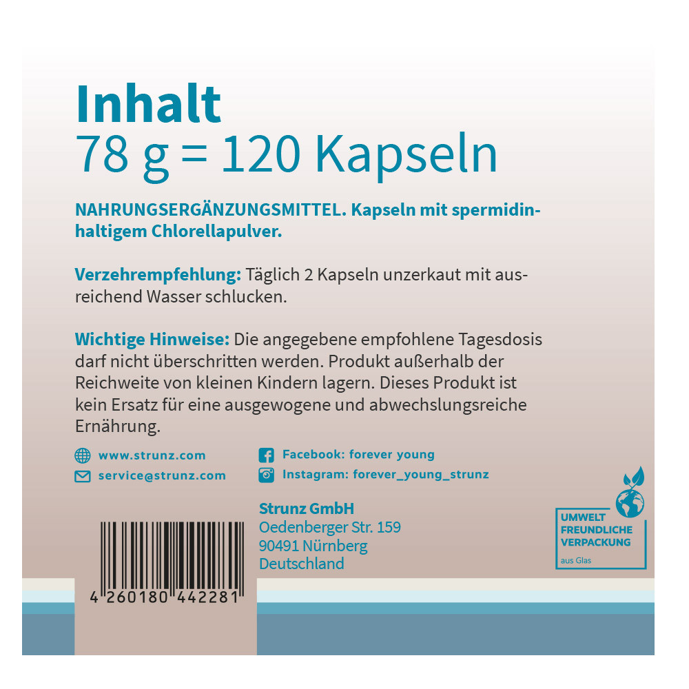 Chlorella vulgaris enthalten natürlicherweise viel Spermidin. Es ist außerdem in Weizenkeimen, japanischem Natto, Kürbiskernen und gereiftem Käse enthalten. Allerdings ist der Spermidingehalt in Lebensmitteln stark von der Verarbeitung und Lagerung abhängig und unterliegt teilweise großen Schwankungen. Unsere forever young Spermidin Kapseln enthalten einen standardisierten Gehalt von 1,7 mg Spermidin je Kapsel.