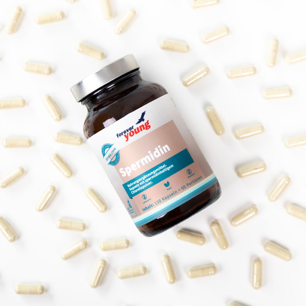 Die forever young Spermidin Kapseln liefern 1,7 mg Spermidin aus Clorella vulgaris. Gezüchtet in der EU.