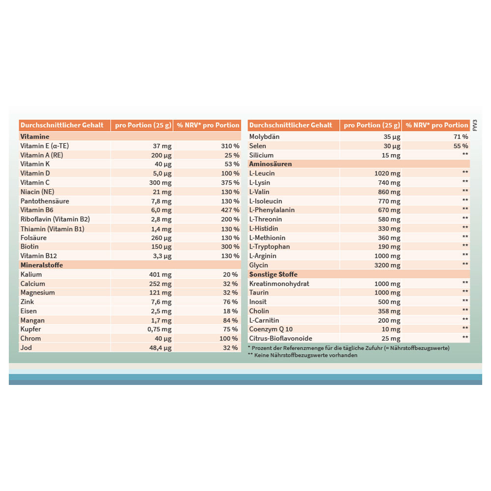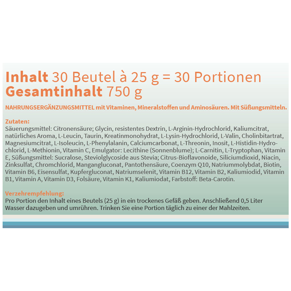 Säuerungsmittel: Citronensäure; Glycin, resistentes Dextrin, L-Arginin-Hydrochlorid, Kaliumcitrat, natürliches Aroma, L-Leucin, Taurin, Kreatinmonohydrat, L-Lysin-Hydrochlorid, L-Valin, Cholinbitartrat. Magnesiumcitrat, L-Isoleucin, L-Phenylalanin, Calciumcarbonat, L-Threonin, Inosit, L-Histidin-Hydrochlorid, L-Methionin, Vitamin C, Emulgator: Lecithine (Sonnenblume); L-Carnitin, L-Tryptophan, Vitamin E, Süßungsmittel: Sucralose, Steviolglycoside aus Stevia; Citrus-Bioflavonoide, Siliciumdioxid, Niacin, Zinksulfat, Chromchlorid, Mangangluconat, Pantothensäure, Coenzym Q10, Natriummolybdat, Biotin, Vitamin B6, Eisensulfat, Kupfergluconat, Natriumselenit, Vitamin B12, Vitamin B2, Kaliumiodid, Vitamin B1, Vitamin A, Vitamin D3, Folsäure, Vitamin K1, Kaliumiodat, Farbstoff: Beta-Carotin.