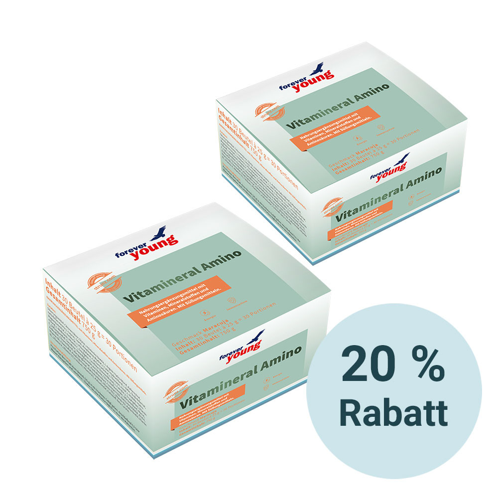 Vitamineral 32 konzentriert sich auf die Versorgung mit 32 Vitaminen und Mineralstoffen. Vitamineral Amino ist gezielt mit einem hochdosierten Aminosäuren-Komplex angereichert, welcher zusätzlich regenerative und leistungssteigernde Effekte hat.
