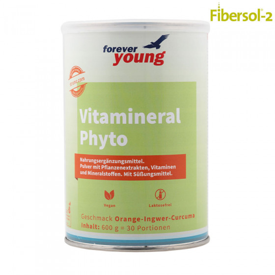 forever young Vitamineral Phyto ist ein Nahrungsergänzungsmittel in Pulverform. Es ist vollgepackt mit Vitaminen, Spurenelementen, Pflanzenstoffen und Ballaststoffen. Die Zusammensetzung basiert auf neuesten Erkenntnissen und wird stetig weiterentwickelt.