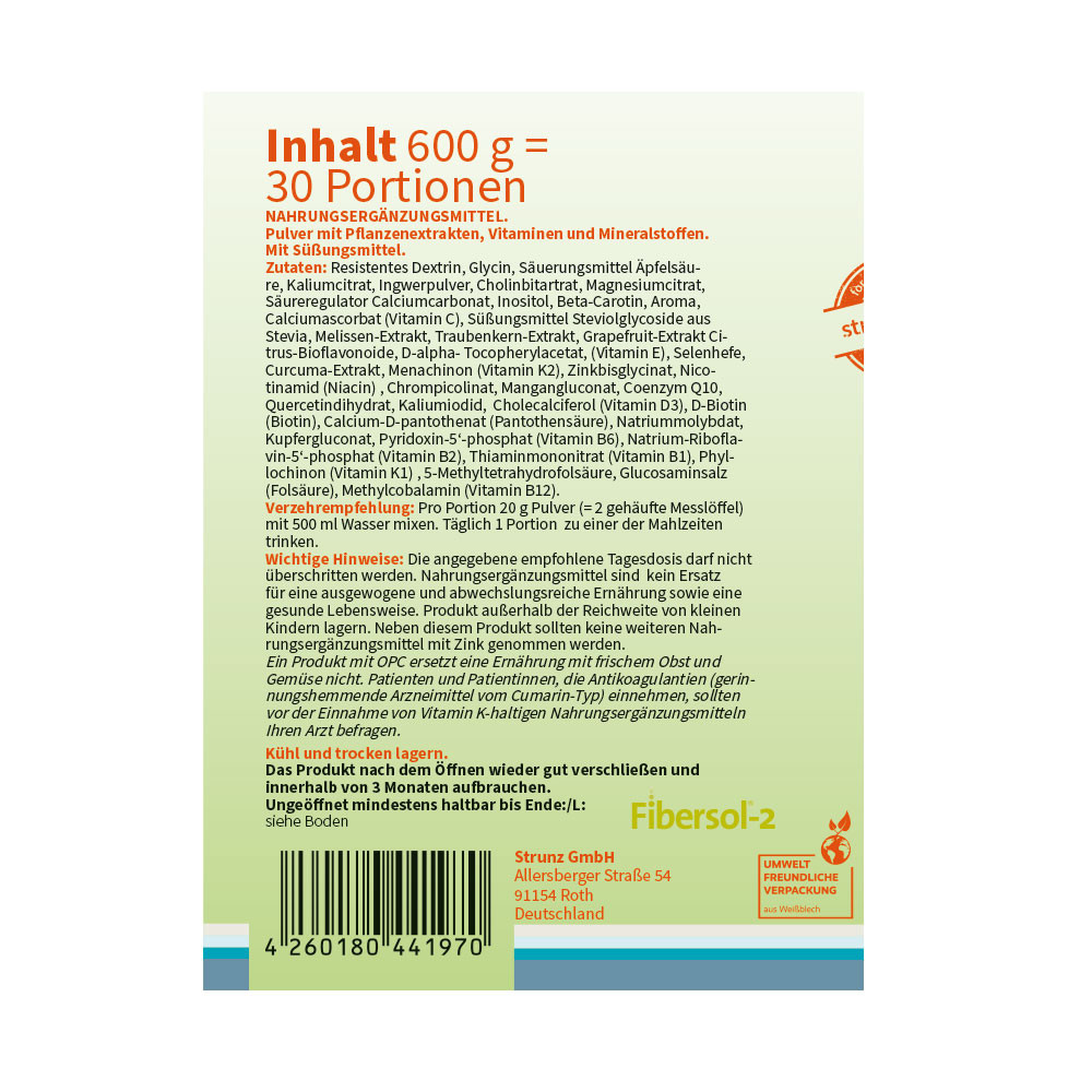 Resistentes Dextrin (Fibersol®-2), Glycin, Säuerungsmittel: Äpfelsäure, Kaliumcitrat; Ingwerpulver, Cholinbitartrat, Magnesiumcitrat, Säureregulator: Calciumcarbonat; Inositol, Beta-Carotin, Aroma, Calciumascorbat (Vitamin C), Süßungsmittel: Steviolglycoside aus Stevia; Melissen-Extrakt, Traubenkern-Extrakt, Grapefruit-Extrakt, Citrus-Bioflavonoide, D-alpha-Tocopherylacetat (Vitamin E), Selenhefe, Curcuma-Extrakt, Menachinon (Vitamin K2), Zinkbisglycinat, Nicotinamid (Niacin) , Chrompicolinat, Mangangluconat, Coenzym Q10, Quercetindihydrat, Kaliumiodid, Cholecalciferol (Vitamin D3), D-Biotin (Biotin), Calcium-D-pantothenat (Pantothensäure), Natriummolybdat, Kupfergluconat, Pyridoxin-5‘-phosphat (Vitamin B6), Natrium-Riboflavin-5‘-phosphat Vitamin B2), Thiaminmononitrat (Vitamin B1), Phyllochinon (Vitamin K1), 5-Methyltetrahydrofolsäure, Glucosaminsalz (Folsäure), Methylcobalamin (Vitamin B12).