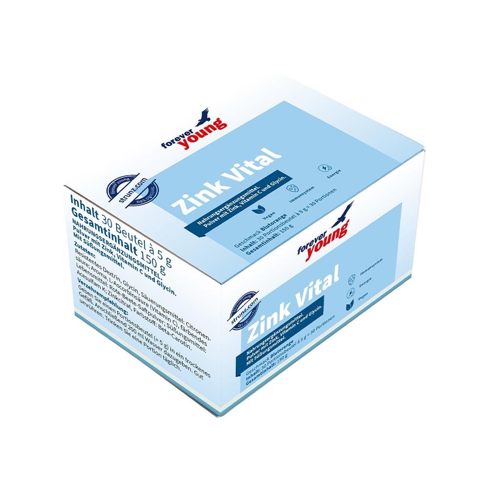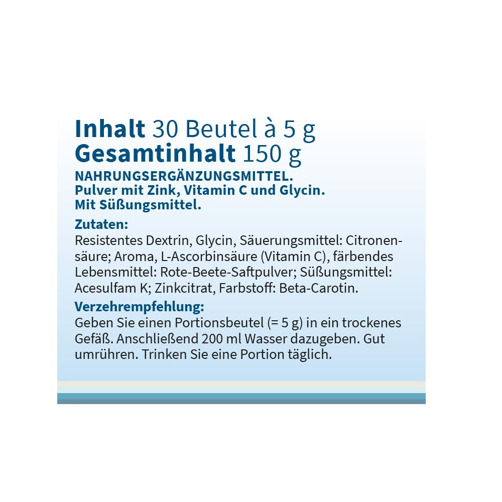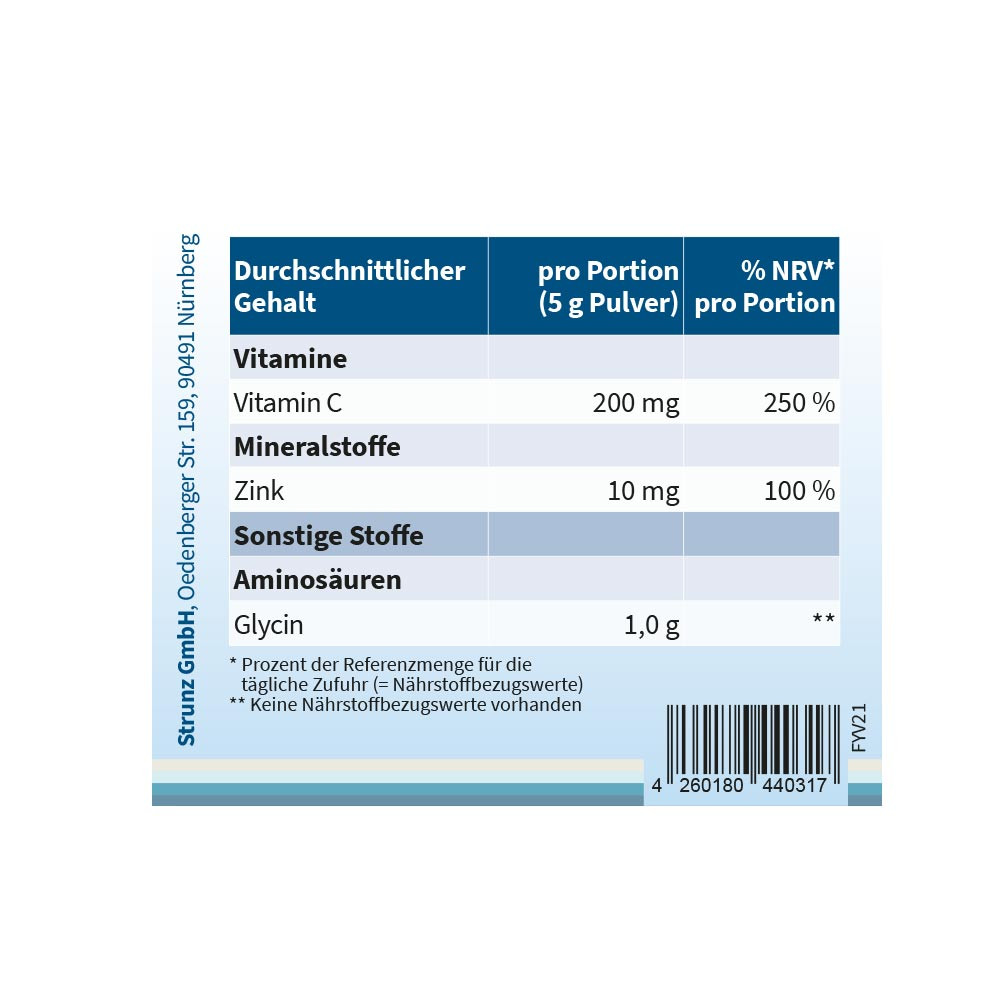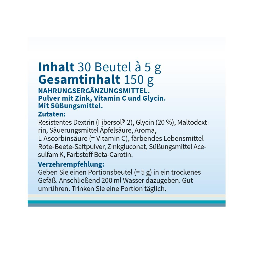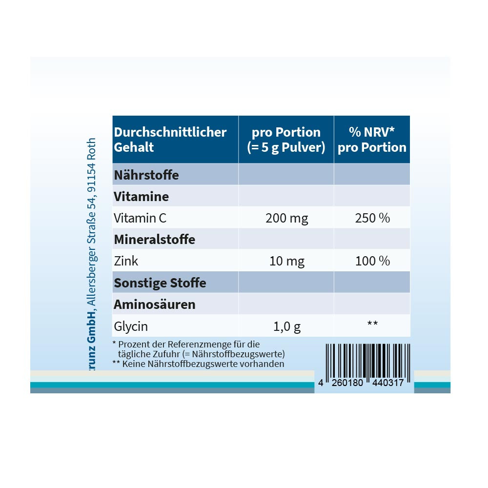 Zink Vital ist ein Nahrungsergänzungsmittel in Pulverform mit 10 mg Zink, 200 mg Vitamin C und 1 g Glycin pro Portion.