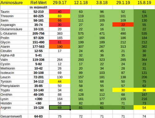 ich habe nun auch wieder ein Aminosäureprofil schreiben lassen und es wird immer besser. Jetzt sind sogar einige Aminos über der oberen Grenze (Leucin, Isoleucin).