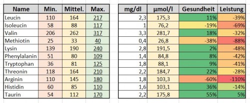 ich habe ein Aminogramm erstellen lassen, und heute kam das Ergebnis. Bei fast allen Werten liege ich gut im Mittelfeld des Referenzbereiches des Labors. Leider kann ich die Werte nicht so einfach mit den Werten vergleichen, die Dr. Strunz empfiehlt, weil sie in mg/dl angegeben sind. Das erhöhte Glutamin von 13,6 mg/dl beunruhigt mich nicht weiter.