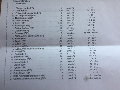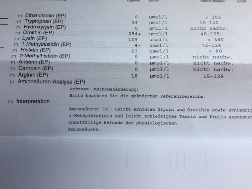 ich habe mein Aminogramm machen lassen, aber bin mir unsicher was ich supplementieren soll. Ich habe bisher an Aminosäuren nur Glycin und Glutamin genommen (plus zig verschiedene NEMs). Bestellt habe ich nun: Taurin, Prolin, GABA und Tryptophan (für den Schlaf). Bei Arginin bin ich mir unsicher wegen nitrosativem Stress. Was müsste ich noch nehmen? Könnt ihr mir ein gutes Buch empfehlen?