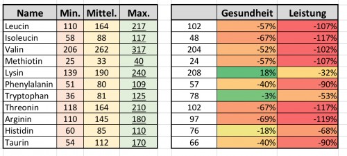 ich habe mir mal die Werte deiner essentiellen Aminosäuren in meine Tabelle geschrieben, welche sich auf die Strunz-Werte bezieht. Dort kann man sehen, dass dein Immunsystem gerade sehr schwach ist. Mindestens die Mittelwerte sollte man erreichen, besser noch in Richtung Maximalwerte.
