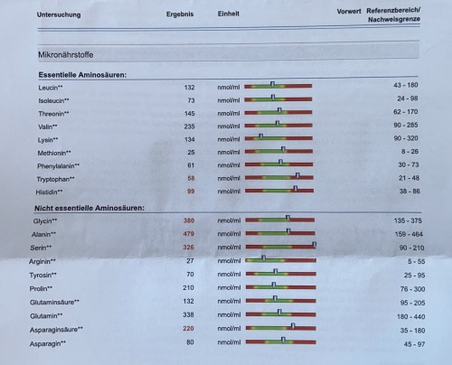 Das sieht dich schon mal gut aus, ok...Lysin ist etwas tief, wie auch Arginin. Leider fehlen Glutathion, Taurin und Citrullin.