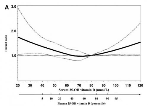 "Es gab einen U-förmigen Zusammenhang zwischen Vitamin D-Konzentrationen und der Gesamtmortalität. Bei Männern wurde bei den niedrigsten 10% (<46 nmol / l) und den höchsten 5% (> 98 nmol / l) der Plasma-25 (OH) -D-Konzentrationen im Vergleich zu mittleren Konzentrationen eine um etwa 50% höhere Gesamtmortalitätsrate beobachtet. Die Krebssterblichkeit war auch bei niedrigen Plasmakonzentrationen (multivariabel angepasste HR: 2,20; 95% CI: 1,44, 3,38) und bei hohen Konzentrationen (HR: 2,64; 95% CI: 1,46, 4,78) höher. Für den kardiovaskulären Tod zeigten nur niedrige (HR: 1,89; 95% CI: 1,21, 2,96), aber nicht hohe (HR: 1,33; 95% CI: 0,69, 2,54) Konzentrationen ein höheres Risiko. Sowohl hohe als auch niedrige Konzentrationen von Plasma 25 (OH) D sind mit einem erhöhten Risiko für die Gesamt- und Krebssterblichkeit verbunden. Niedrige Konzentrationen sind mit kardiovaskulärer Mortalität verbunden."