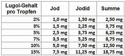 Jodid pro 1 ml = 66 mg, pro Tropfen = 3,6 mg max.; Jod pro 1ml = 44mg, pro Tropfen = 2,4 mg min.