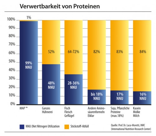 die Amino 8 (bzw. die neuen Amino 11) basieren auf der Rezeptur der MAP (Master Amino Pattern) und sollen angeblich die beste biologische Verwertbarkeit haben, da sie das Verhältnis aufweisen, wie es der Körper benötigt und somit keine Stickstoffabfälle entstehen sollen. Einige glauben das (so auch Dr. Strunz) und einige glauben das nicht, da jeder Menschen einen individuellen Bedarf an Aminosäuren hat. Wenn man davon ausgeht, dass das alles so stimmt, dann sind 10g Amino 8 equivalent zu 62g Proteinshake. Oder anders gesagt: Von Proteinshakes werden 16% des Eiweißes im Körper aufgenommen, von Amino 8 99%.