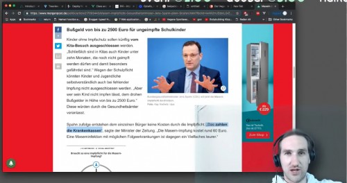 Was die Politik sich so ausdenkt ... 2500€ Strafe fürs Nichtimpfen ... mehr dazu hier (ist am Anfang recht viel Werbung, war 'n Livestream, in dem Fall bei etwa 15min rein gehen): https://www.youtube.com/watch?v=GHSarxUwHC8 Ergänzend: ich mag vieles, was Daniele Ganser sagt (der wird auch in diesem Video erwähnt) und ich will mit dem Video niemanden zum Veganismus bekehren (-> der vergane Germane), bin es ja selber nicht, auch wenn ich mir wünsche, so leben zu können ... :-/ Kann hier nur DDR 2.0 wiederholen; mußte gerade daran denken, Robert, sorry und ist ausdrücklich nichts gegen Dich. Glückwunsch an dieser Stelle auch von mir für Dein Buch und Gutes Gelingen Deines Vortrages in der Fa.! :)
