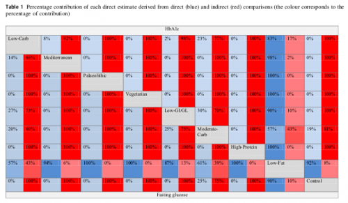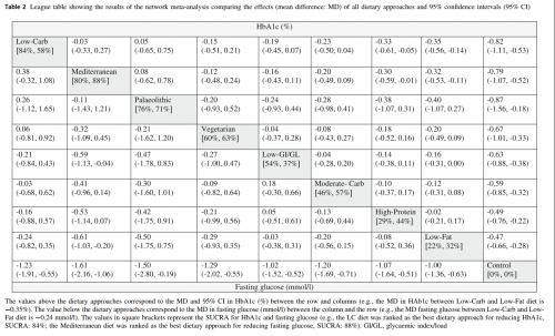 Schaut man sich die Ergebnistabelle an, liegt LC nur bei Reduktion HbA1c vorne (84%), dicht gefolgt von der Mediterranen Diät (80%). Beim Punkt "Senken der Nüchtern-Glukose" sieht es dagen ganz anders aus. Da liegen Medit. (88%), Paläo (71%), Vegan (63%) vor LC (58%), dicht gefolgt von Mod-Carb (57%).