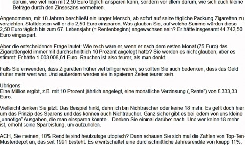 … ist das tatsächliche Erreichen der 1-Million-Euro-Marke zum 67. Lebensjahr, wenn sie denn die 75,-€ monatliches Zigarettengeld anlegen würden.