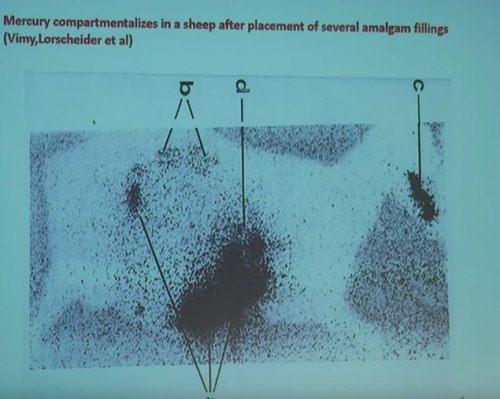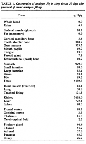 Damit man auch mal die Tragweite sieht. Diesem Schaaf hat man 12 Amalgamfüllungen eingebracht und für 29 Tage drin gelassen. Dann wieder entfernt. Ein Teil des Quecksilbers war radiaktiv markiert. Hier das Ergebnis:
