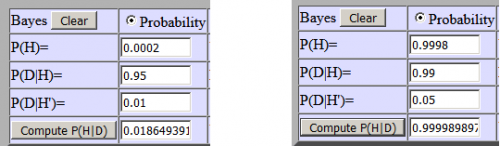 Statt selbst zu rechnen, kann man heutzutage natürlich auch Bayes-Rechner im Internet finden. Leider werden da öfter andere Begriffe verwendet. Einen, mit dem die Rechnung einfach nachzuvollziehen sein sollte, habe ich auf http://psych.fullerton.edu/mbirnbaum/bayes/BayesCalc.htm gefunden. Hier die beiden Rechnungen im Vergleich: